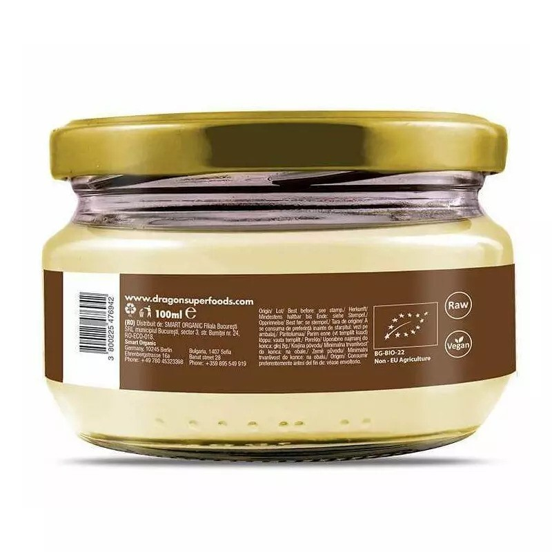 Grasimea de cacao bio Dragon Superfoods este obtinuta din boabe de cacao ecologice, prin procesare la rece, pastrand intacte aroma naturala si proprietatile specifice untului de cacao. Produsul este raw, vegan si certificat ecologic, avand grad alimentar, ceea ce il face potrivit atat pentru uz culinar, cat si pentru aplicatii cosmetice.