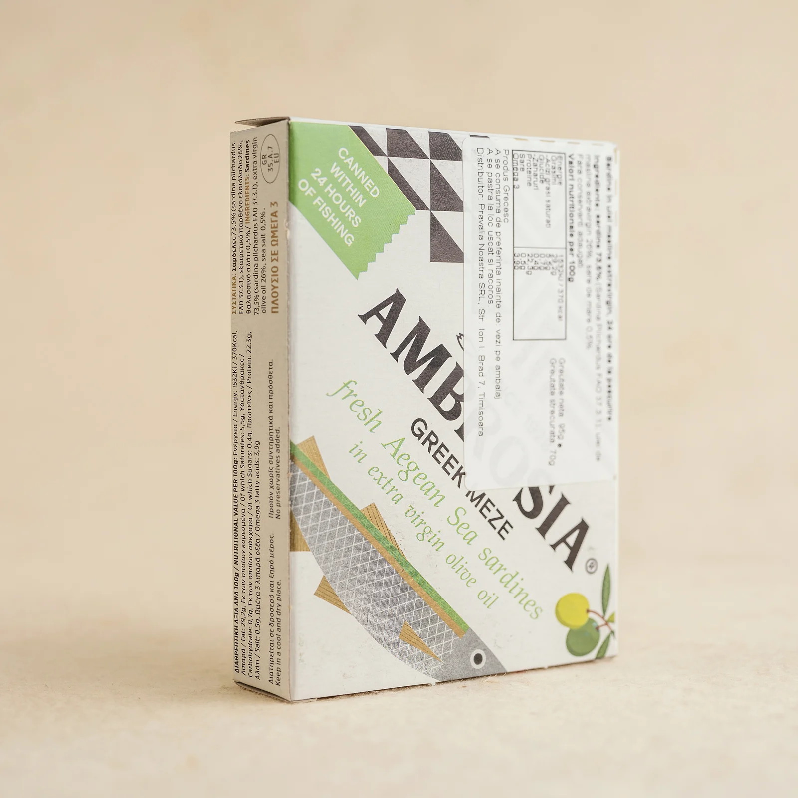 Descopera savoarea autentica a Greciei cu sardinele Ambrosia, pescuite din apele cristaline ale Marii Egee si conservate cu grija in ulei de masline extravirgin. Aceste delicatese sunt alegerea perfecta pentru cei care apreciaza un gust natural, bogat si plin de nutrienti esentiali.